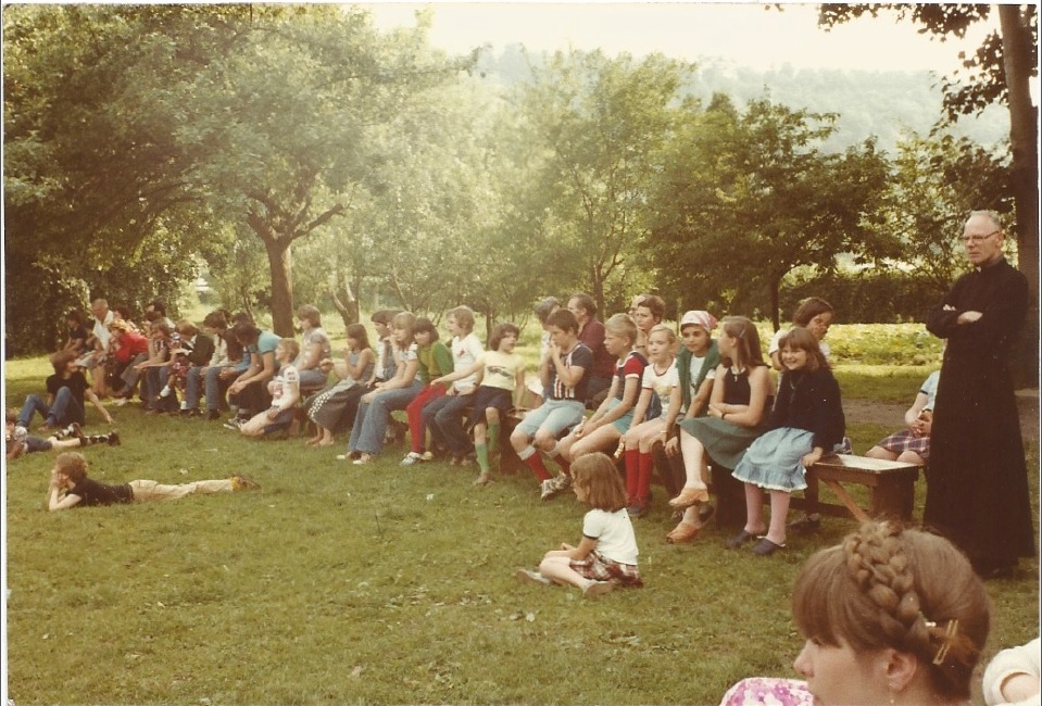 0174_1978 : COMBLAIN-LA-TOUR : Devant la petite chapelle : Ks Kurzawa ; Ks Kiek ; Pani Bardo ; Mr Paterka ; Michel Konarski ; Richard Szymczak ; ?….