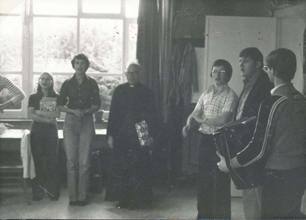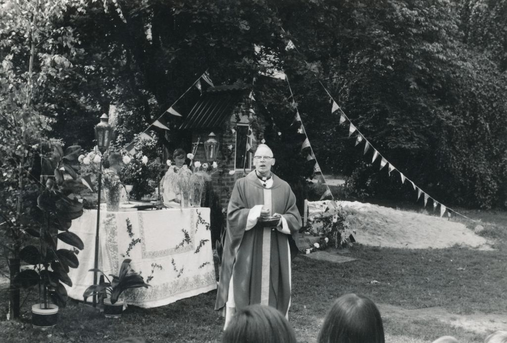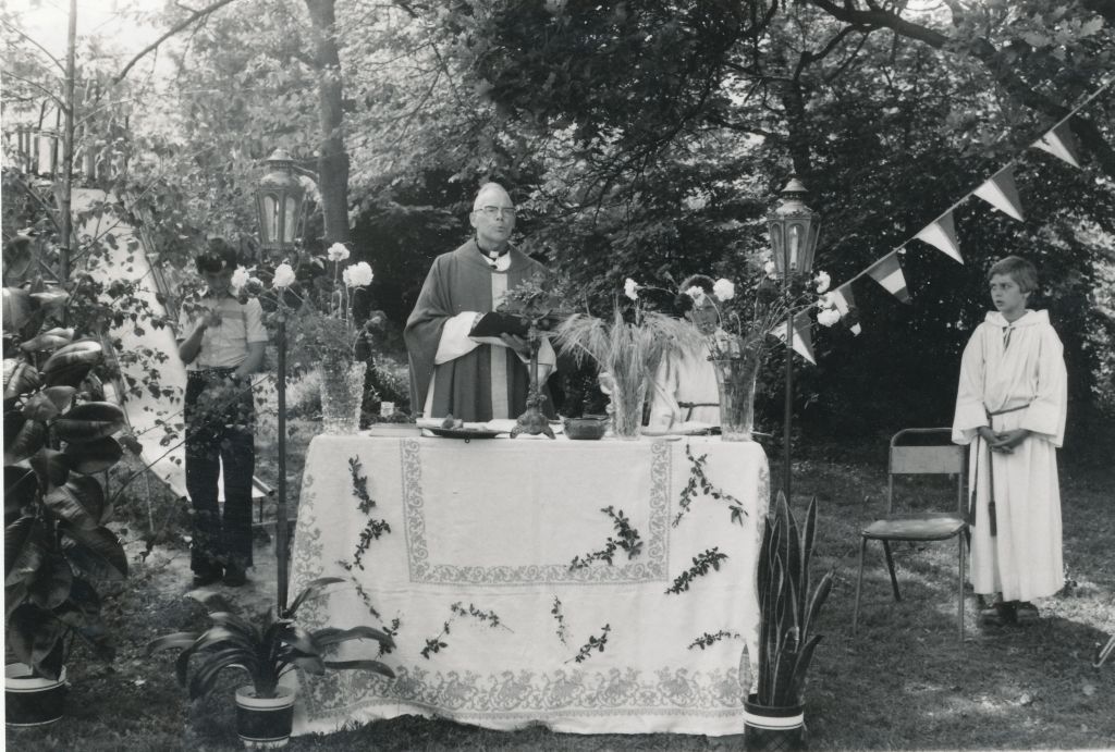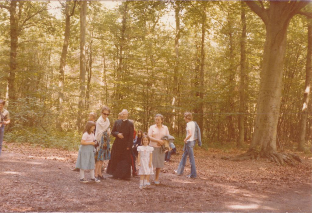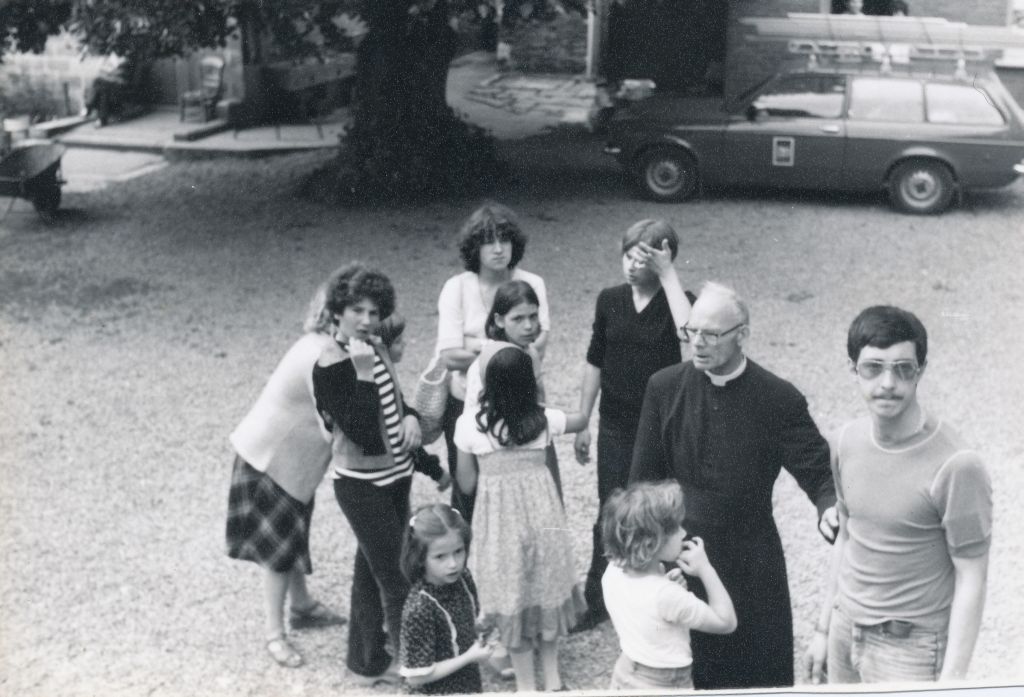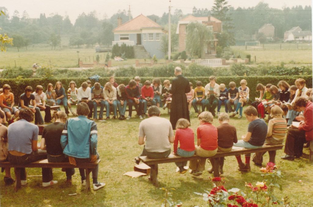 La première photo d’aujourd’hui date de 1979, c’est-à-dire déjà presque 20 ans après le début des colonies à Comblain. Le prêtre est toujours là. On a même l’impression que c’est la même soutane depuis le début ! En tout cas, c’est le même regard bienveillant sur les enfants qui l’entourent. Et même si les enfants regroupés autour de lui sont déjà la Nième génération à se succéder, il n’y a que les visages qui ont changé … les sourires, le plaisir, la sérénité et la quiétude sont les mêmes. Ils ont l’air serein. Que pouvait-il leur arriver ? Rien, ils sont là à l’abri, à l’ombre de Ks Kurzawa.