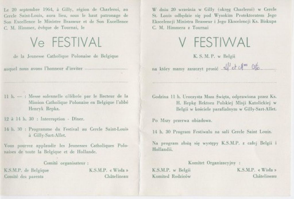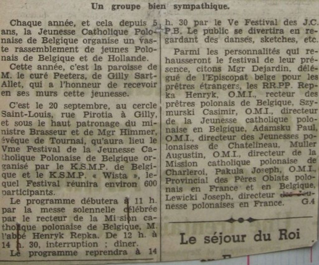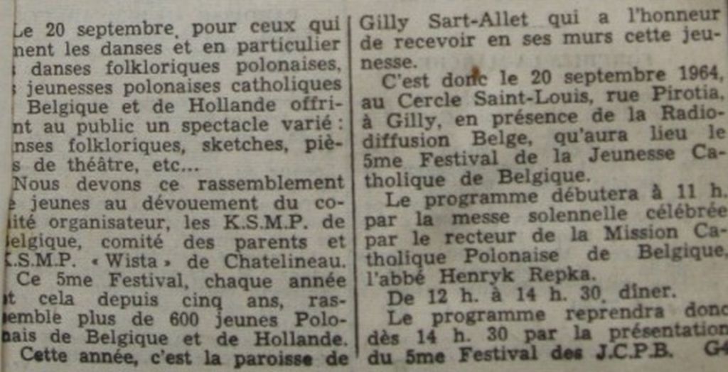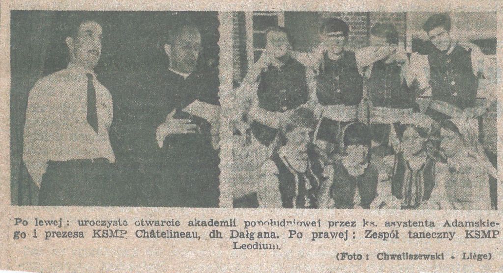 Mr. Kwiatkowski adresse également les meilleurs vœux du Père Czajka, ancien curé de Charleroi, qui n’a pas pu assister en personne au festival, mais qui est très satisfait des réalisations de la jeunesse polonaise de Belgique. Et enfin, l’orateur, salue l’assistance, au nom du « Narodowiec » et de son éditeur Mr Kwiatkowski qui passe son existence au service des mêmes idéaux que ceux défendus par le KSMP.