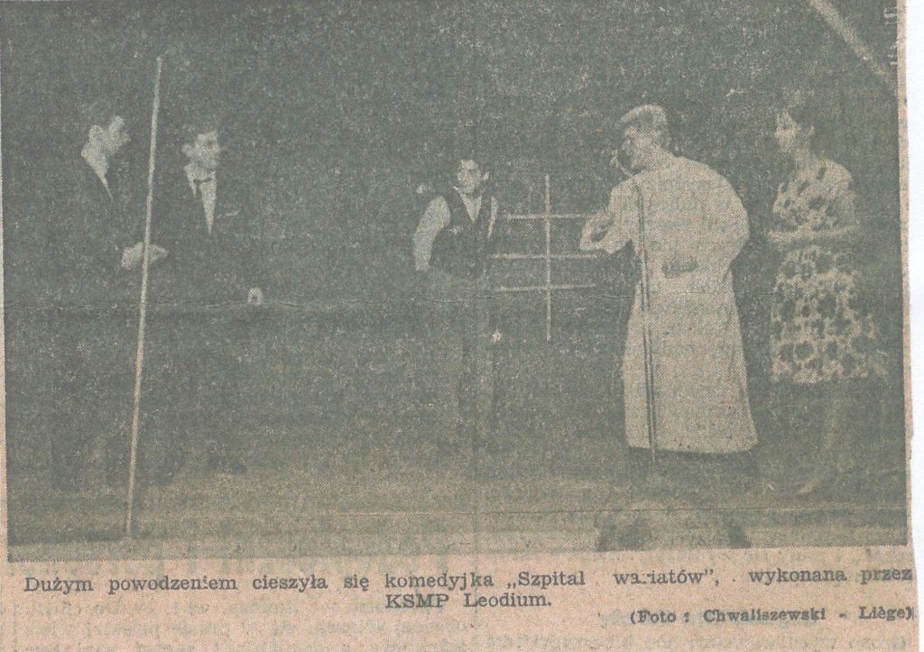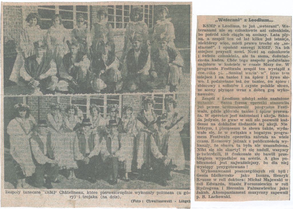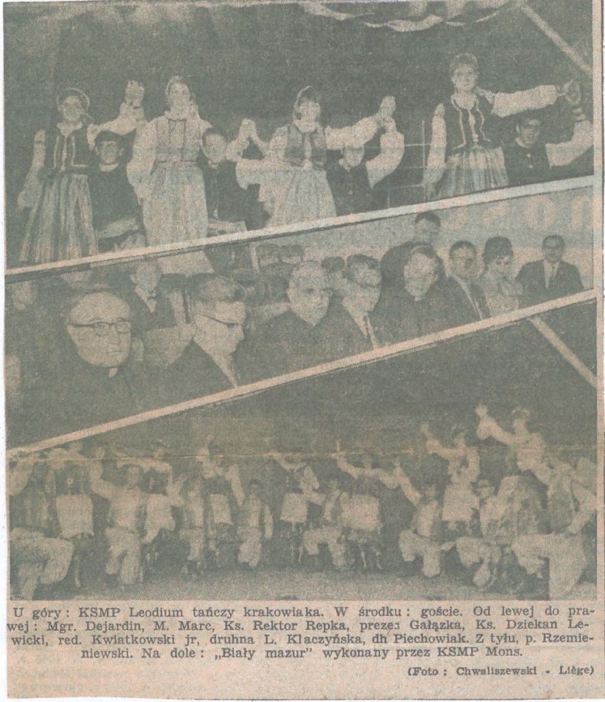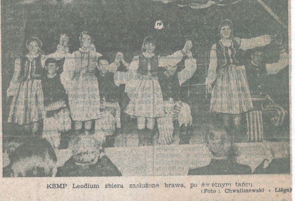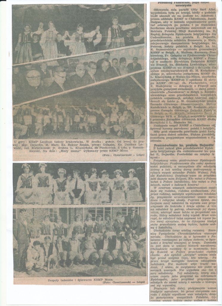 Et enfin, le KSMP de la région de Mons. Le groupe s’est déjà fait une réputation pour le chant, dirigé par Mr. J. Karasiński, et pour la danse, dirigée par Mr. E. Łagocki. La prestation de cet ensemble, dans le cadre du festival KSMP, a confirmé l’opinion dont il bénéficie. Et on a déjà beaucoup écrit sur ce sujet. Il faut ajouter ici que le répertoire des chansons du groupe est de plus en plus riche et international. Outre les chansons polonaises, il interprète également des chansons françaises et italiennes.