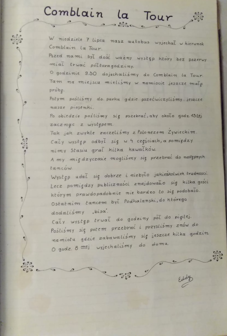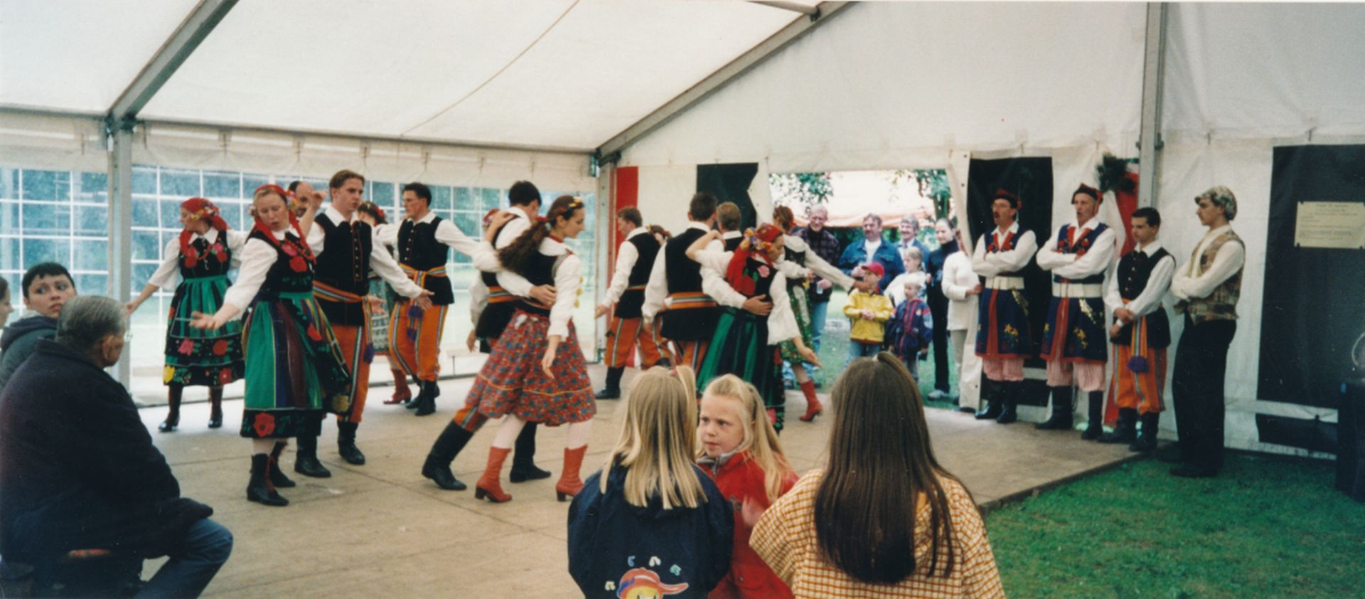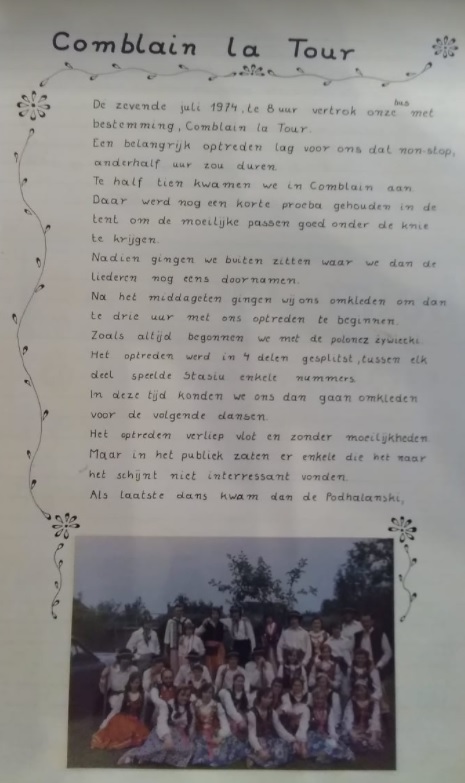 Pour l’édition 74, c’est déjà l’ensemble « Wisła » de Winterslag qui a assuré le spectacle sur la scène, en dessous du grand chapiteau. Les spectateurs enthousiastes ont applaudi les artistes à tout rompre. Cette représentation – comme toutes les autres d’ailleurs – a été scrupuleusement retranscrite dans la « Kronika » de Wisła Winterslag, véritables annales des activités du groupe. Vous trouverez ici les pages consacrées à la majówka de 1974 … en polonais et en néerlandais.