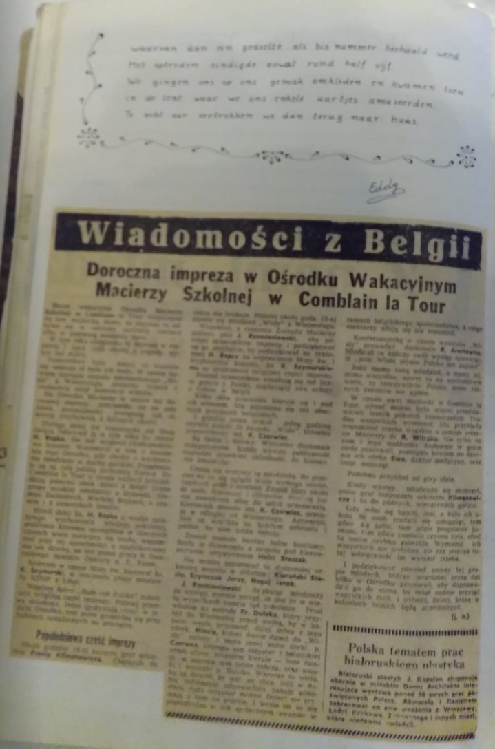 Durant cette « Majówka » à Comblain-la-Tour, on pouvait voir plus de représentants de trois générations en même temps. Difficile de les nommer tous. Par exemple, il faut mentionner le Dr R. Wilczek, président de la Macierz Skolna, lui-même et sa femme n’étaient pas les seuls à travailler littéralement à la sueur de leur front, car leur fille Ewa, docteur en médecine, et leurs trois petits-enfants les aidaient courageusement. On dit que l’exemple vient d’en haut !