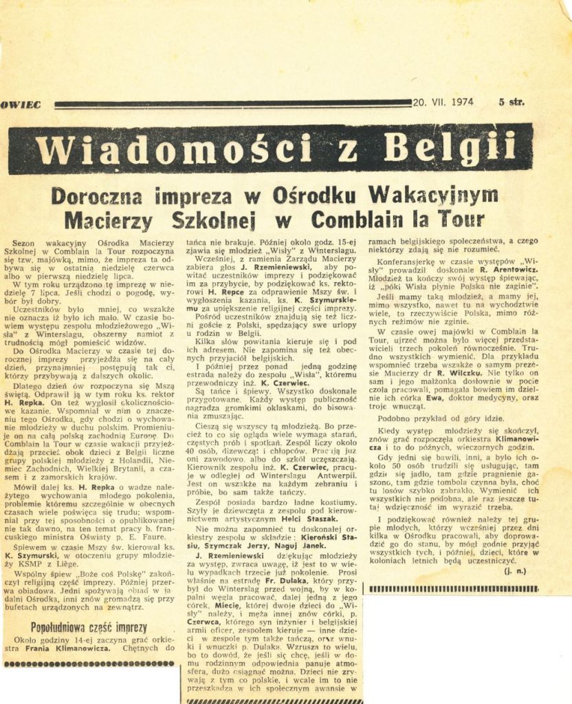 La saison de vacances au Centre de la Macierz Szkolna de Comblain-la-Tour commence avec la « majówka », bien que cet événement ait lieu soit le dernier dimanche de juin, soit le premier dimanche de juillet. Cette année ( 1974 ), l’événement a eu lieu le dimanche 7 juillet. Pour ce qui était de la météo, le choix a été judicieux. Les participants étaient moins nombreux, ce qui ne signifie pas pour autant qu’ils étaient peu nombreux. Pendant la représentation de l’ensemble de jeunes « Wisła » de Winterslag, la tente, pourtant spacieuse, pouvait à peine contenir le public.