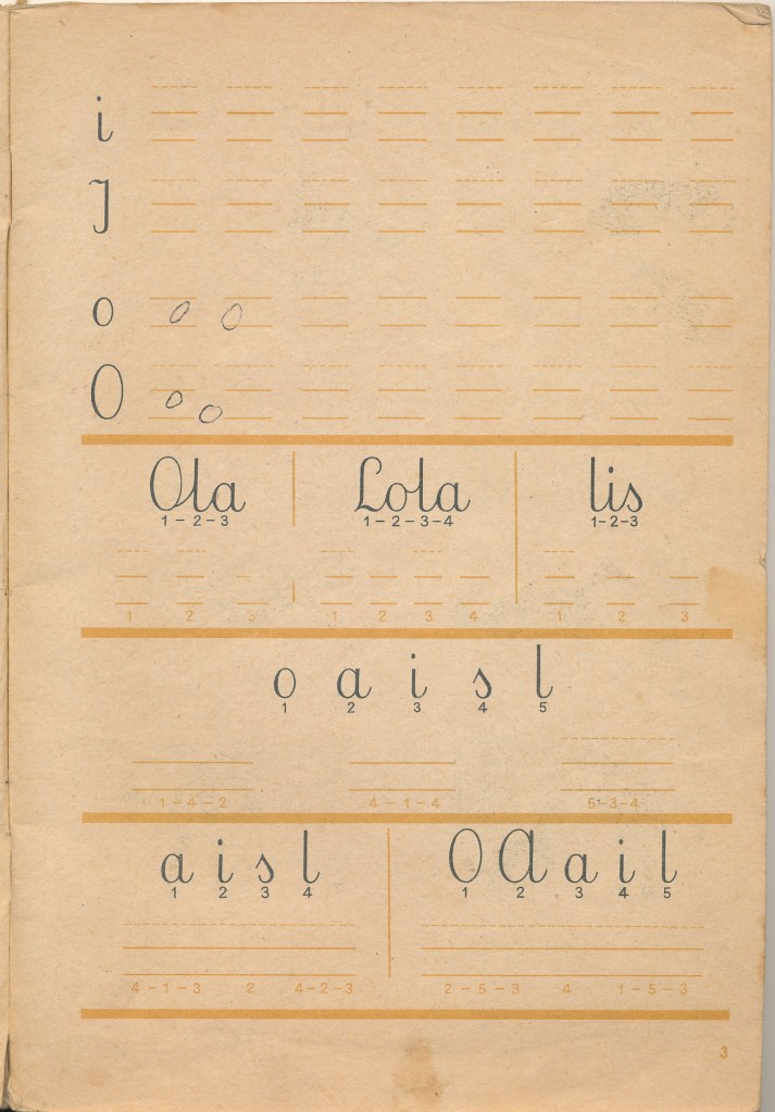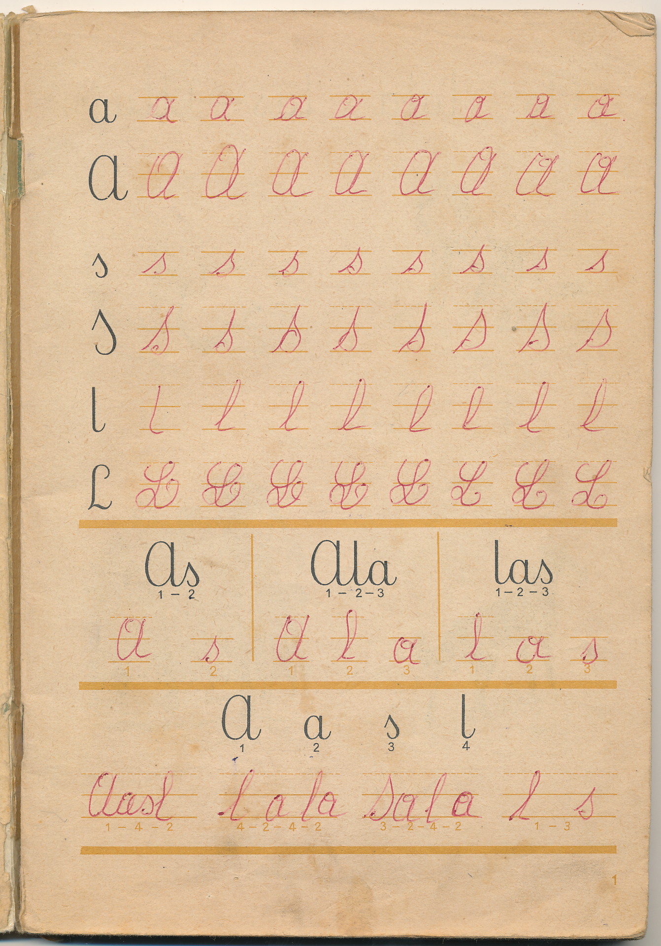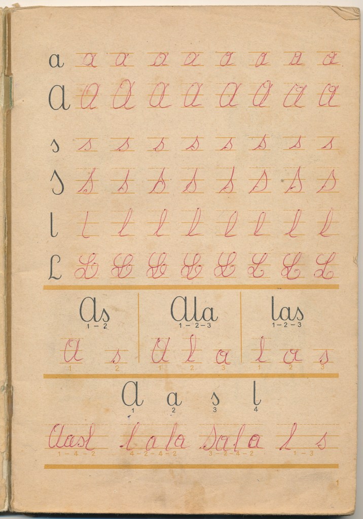 Ce sont d’abord les premiers pas de l’écriture … et comme à l’école « belge », nous pouvions nous aider grâce aux exemples placés juste au-dessus de lignes entre lesquelles il ne fallait pas dépasser.