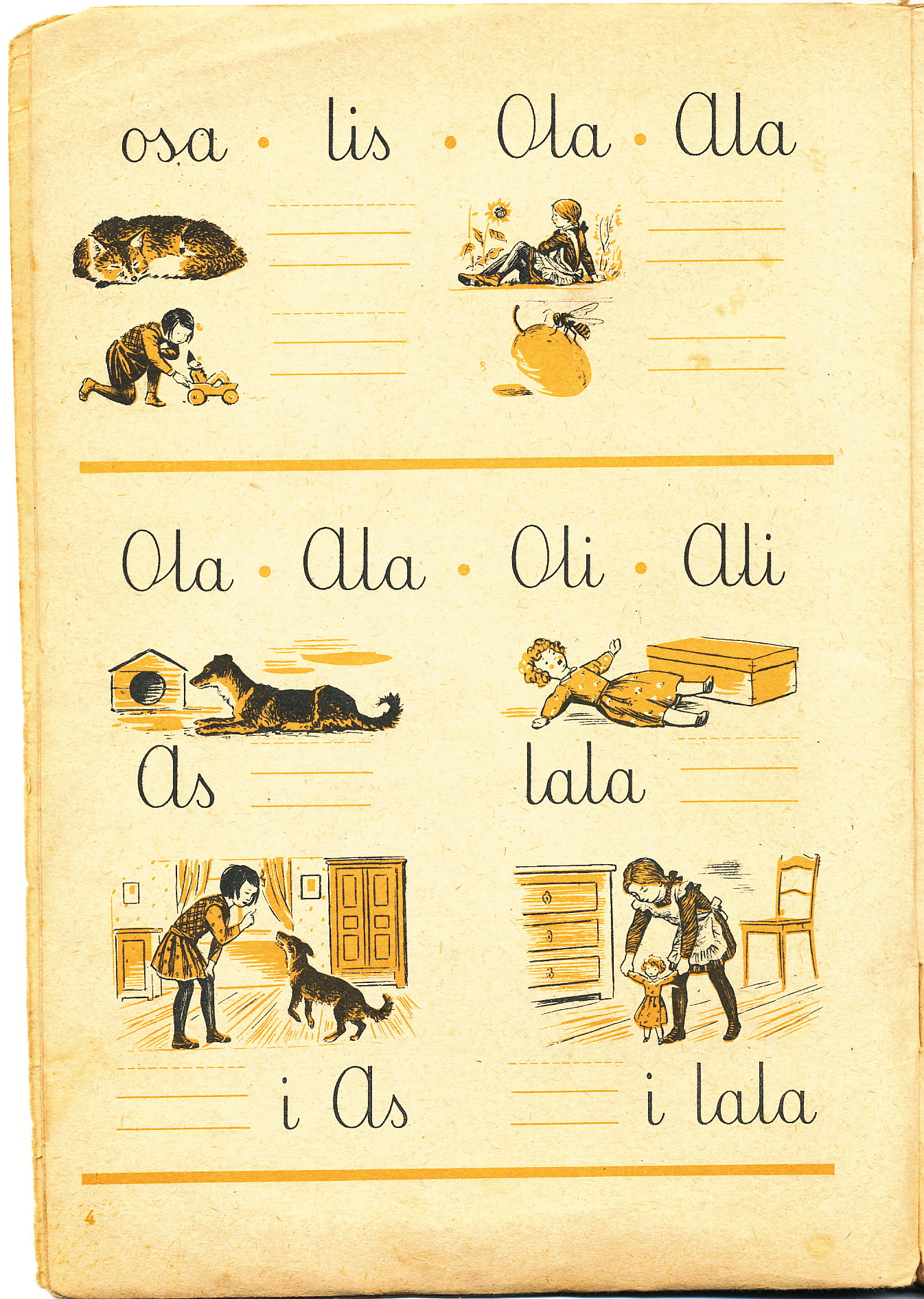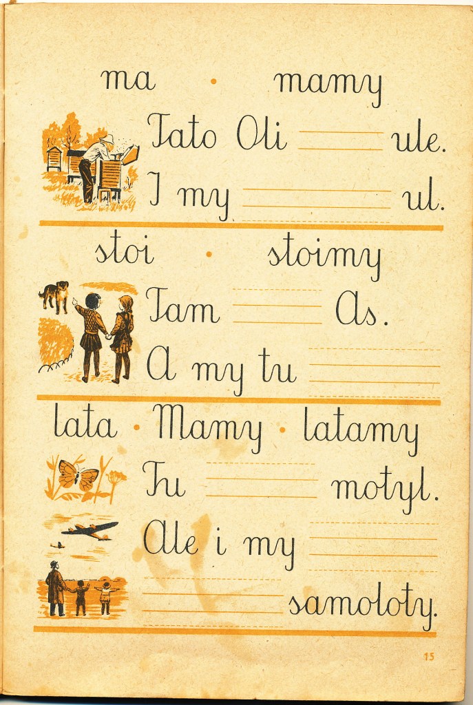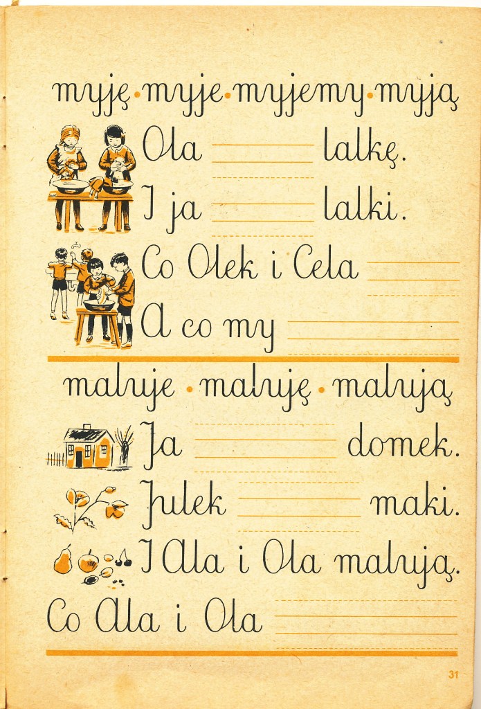 Mais qui se souvient que cet ouvrage était complété par un cahier d’exercices : Ćwiczenia elementarzowe – zeszyt 1 ( Exercices d’initiation – cahier n° 1 ) paru en 1957. Personnellement, je ne m’en souviens plus … et vous ? Voici quelques extraits de ce cahier. On y retrouve évidemment Ala et As, et toute la petite famille. Mais, cette fois-ci, il ne s’agit pas seulement de lire … il faut aussi participer !