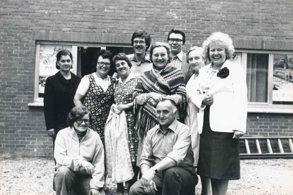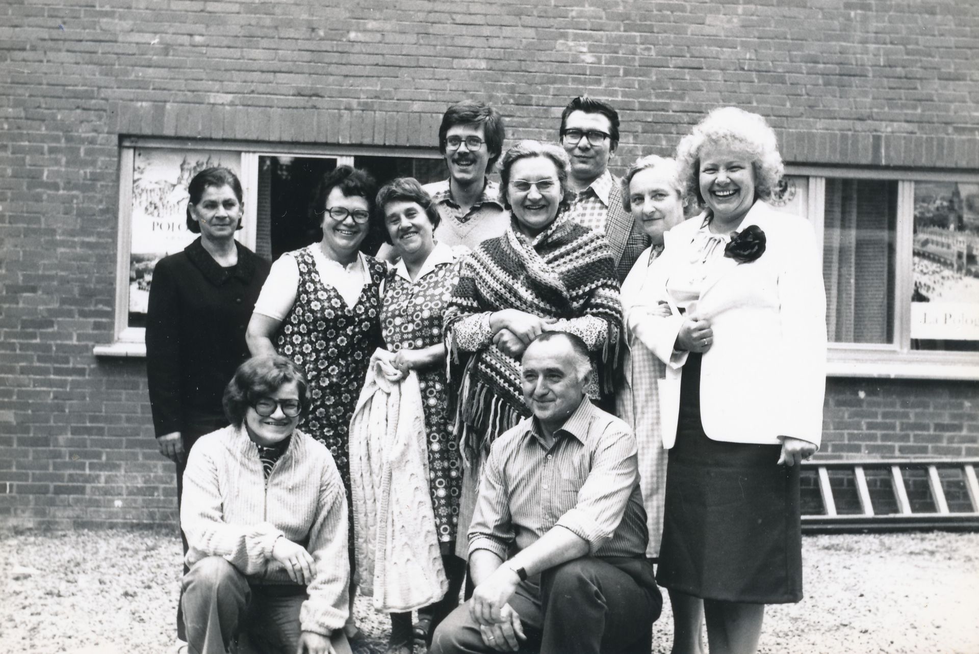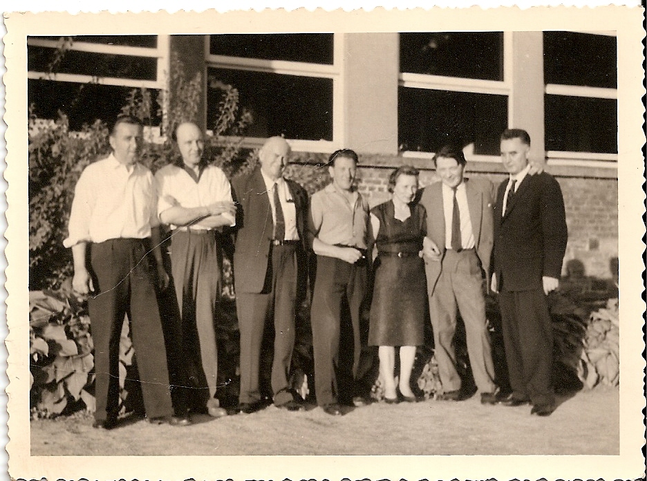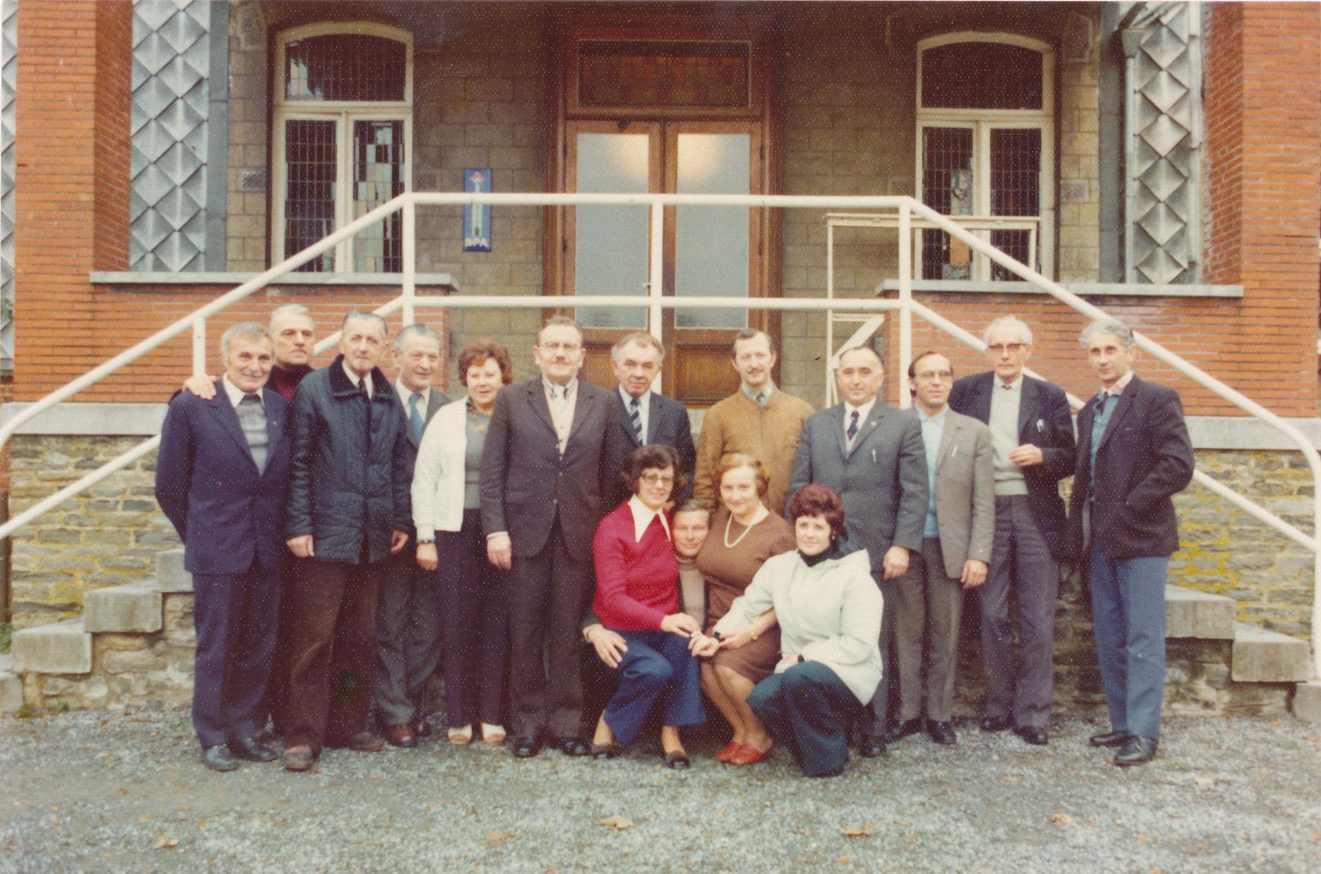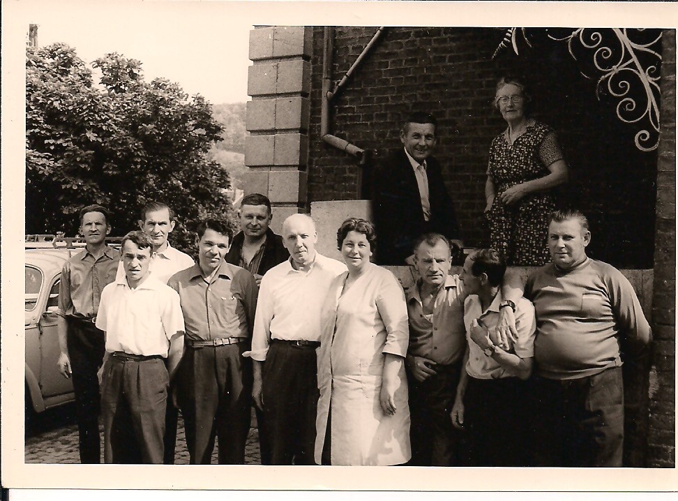 3.564 : COMBLAIN-LA-TOUR : Devant l’escalier, côté grille d’entrée : Devant : Mr Michel Miklusiak ; Mr Rusowicz ; Mr Markiewicz ; Mme ( ? ) ; Mr Kazik Michalski ; Mr Zbigniew Matusiewicz ; Mr Tadek Szymczak ; au second plan : Mr Materna ; Mr Adam Ogonowski ; Mr Ludwig Mazgaj ; sur l’escalier : Mr Walek Chmielecki ; Mme Weronika Załobek.