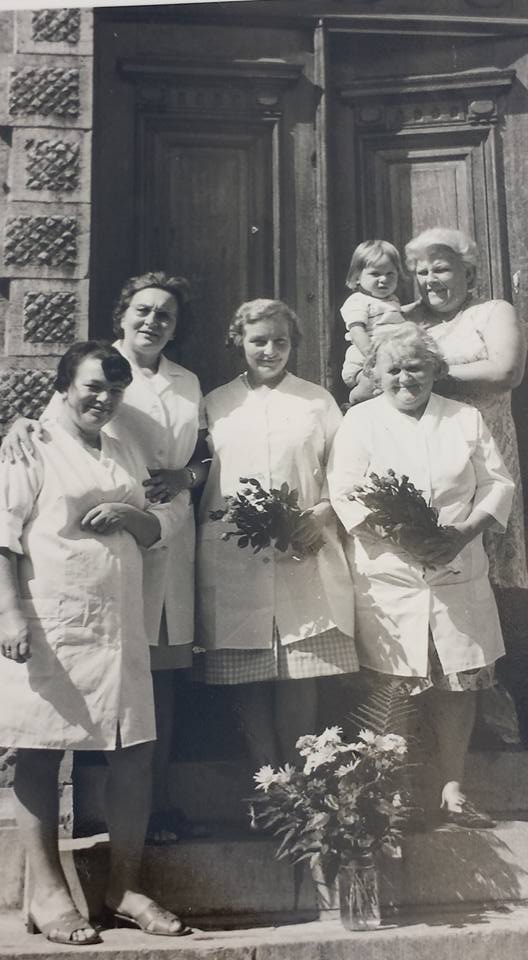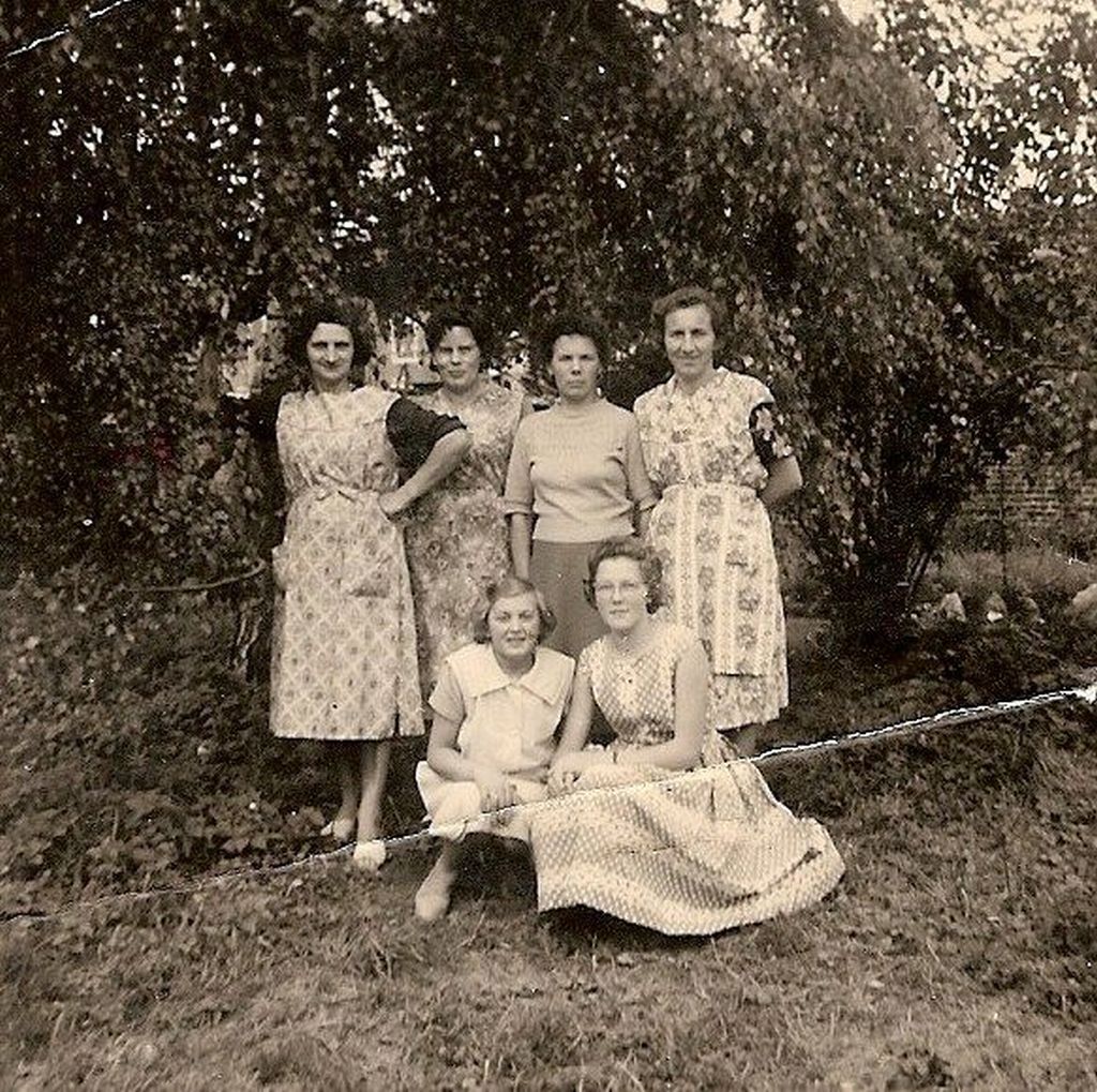 3.567 : COMBLAIN-LA-TOUR : Sur l’escalier de l’entrée : Pani Duszowa, aux cheveux noirs, elle venait chaque année de Pologne pendant 2 mois pour travailler aux cuisines et restait même pour le séjour des retraités ; Mme Bardo ; Mme Koldziejka ; ( ? ) ; Pani Ludka Merta ; l’enfant ( ? ).
