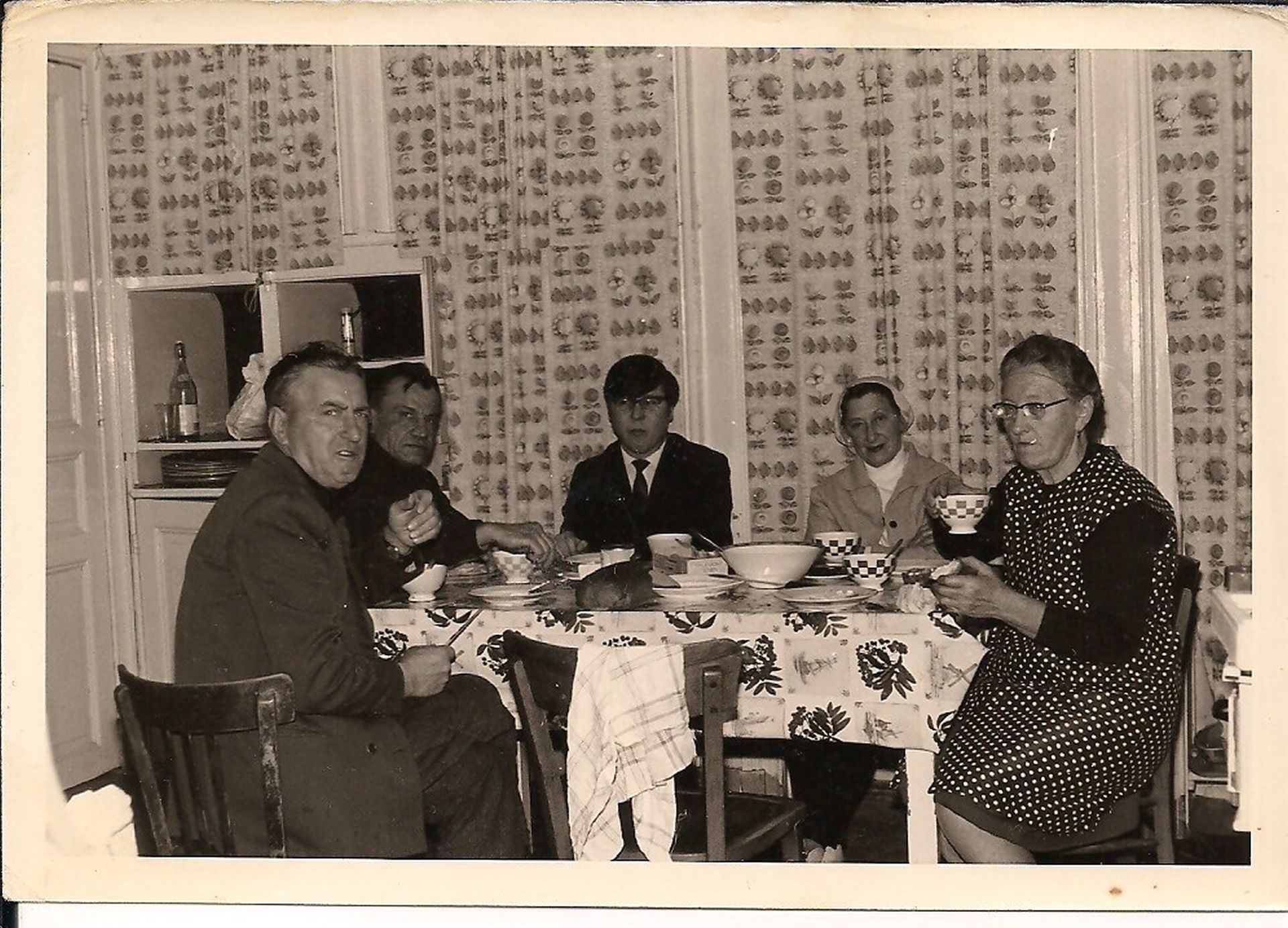 3.569 : COMBLAIN-LA-TOUR : Jan la belote, dans la cuisine : Pan Jan ; Mr Kazik Michalski ; Yurek Stoj ; ( ? ) ; Mme Veronica Załobek ( la grand-mère de Francine et Georges ).