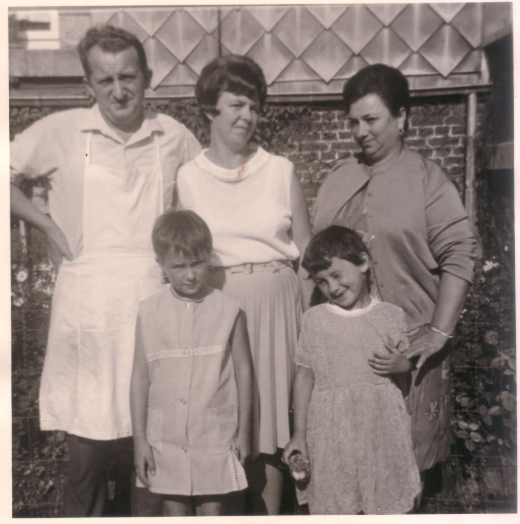 3.573 : COMBLAIN-LA-TOUR : Devant la cuisine : Monsieur Stefan Dudziak ; Madame Anna Konska, son épouse ; Madame Maryska Młynarski ; Thérèse Dudziak ; Patricia Młynarski.