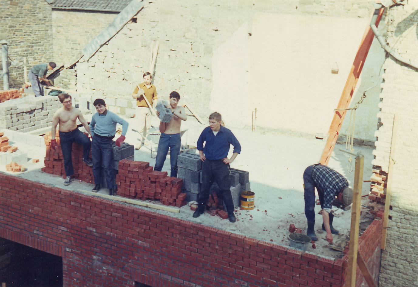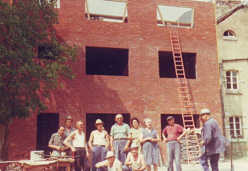 3.576 : COMBLAIN-LA-TOUR – 1972 : Le bâtiment rouge en construction : Mr Zbigniew Matusiewicz ; Pan Jan ; Mr Léon Warchulski ; Mr Walek Chmielecki ; Mr Baron d’Hensies ; ( ? ) ; Mme Veronika Załobek ; ( ? ) ; Mr Franek Bujanowski ; Mr Kazik Michalski ; Mr Léon Czak.